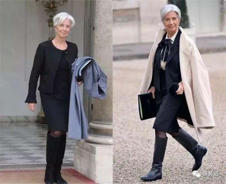 欧洲央行行长拉加德的“上班照”中,出现频率多的也是黑色西服套装。虽然选择的款式有些硬朗,但她很善于丝巾等配饰的搭配,展示出的形象刚柔并济。