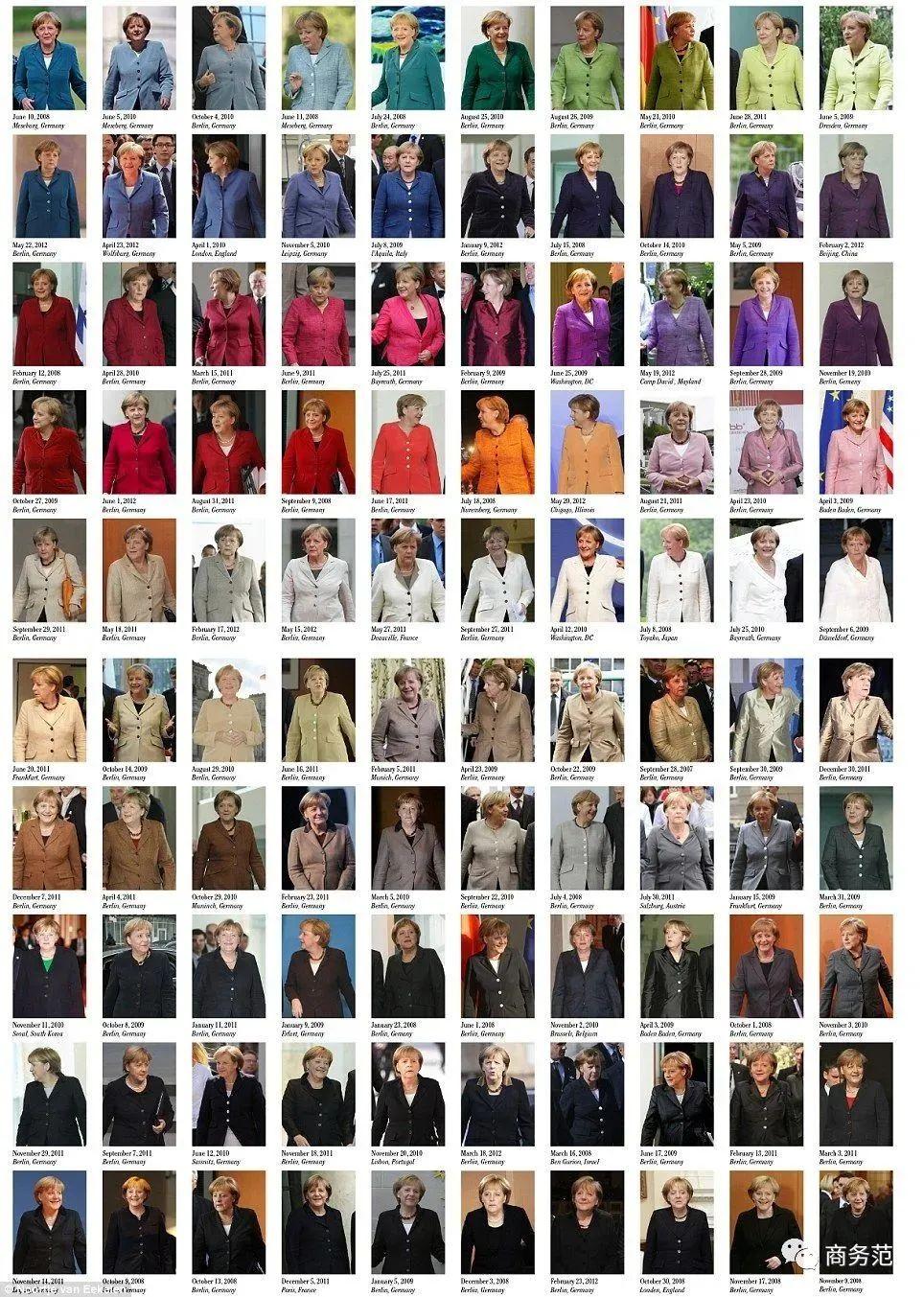之前有位叫Noortje van Eekelen荷兰平面设计师,还总结了她套装的所有颜色,调侃说默克尔把自己穿成了潘通色卡。