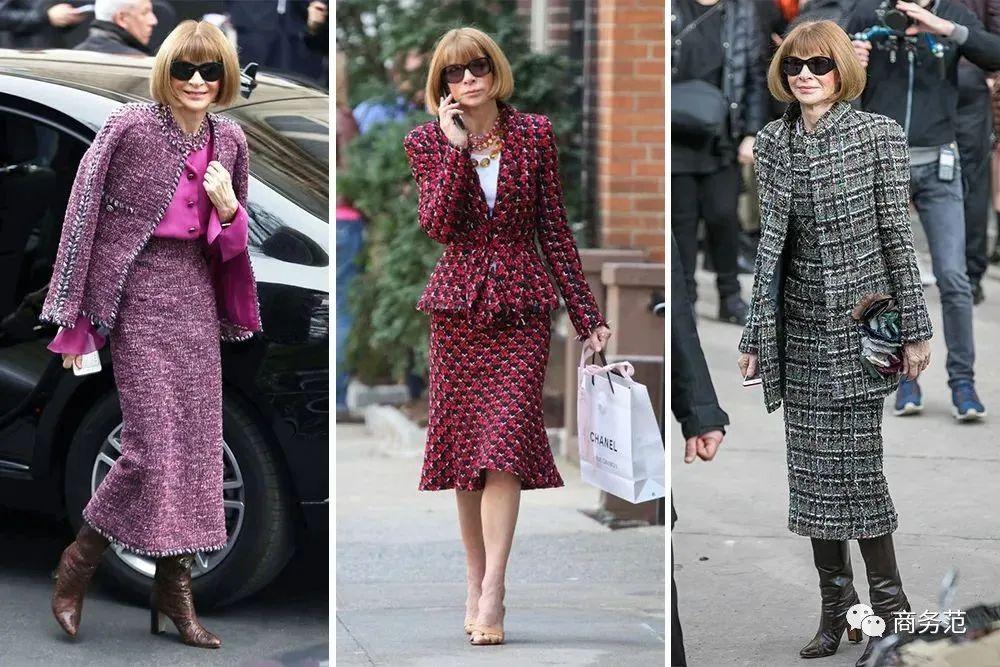 时尚圈女boss们偏爱色彩款式都比较时髦的套装,比如安娜女魔头这几身Chanel斜纹软呢半裙套装,感觉参加party也不违和。