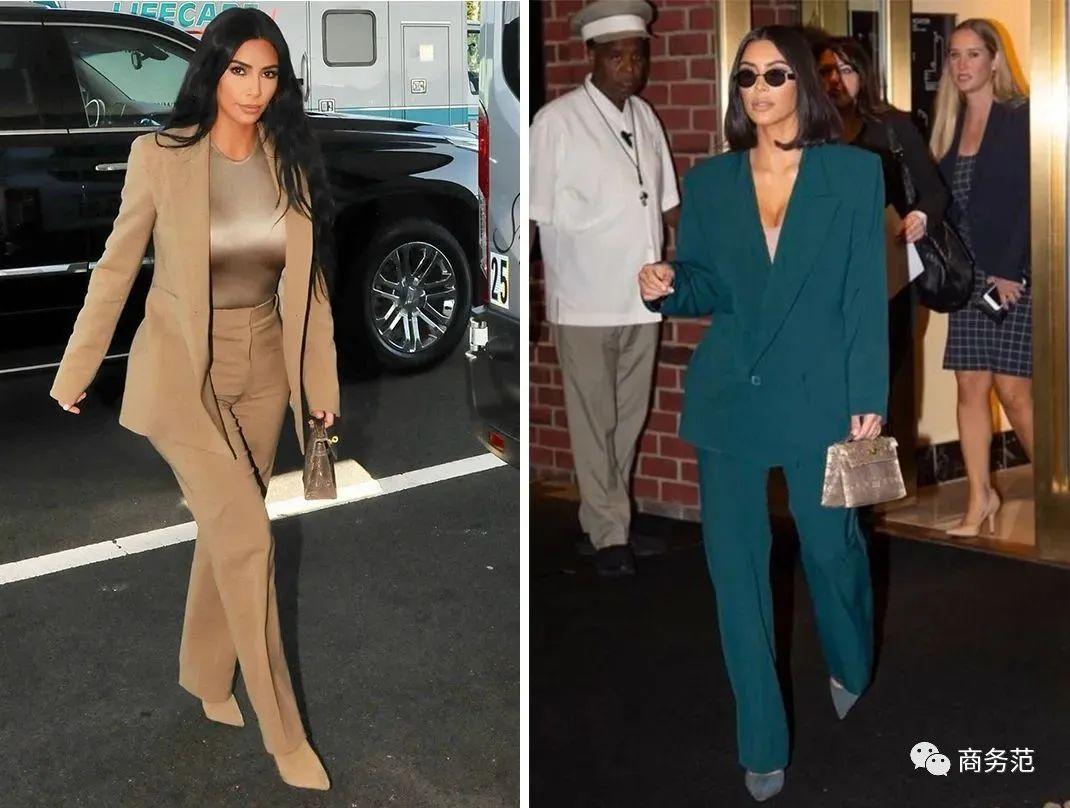 因彩妆、内衣事业正式成为亿万富翁的金·卡戴珊,作为Boss出席一些商务场合时,都少见地穿起套装。不过她喜欢穿的色彩也比较与众不同,难驾驭的金驼色和水鸭绿都上身过。