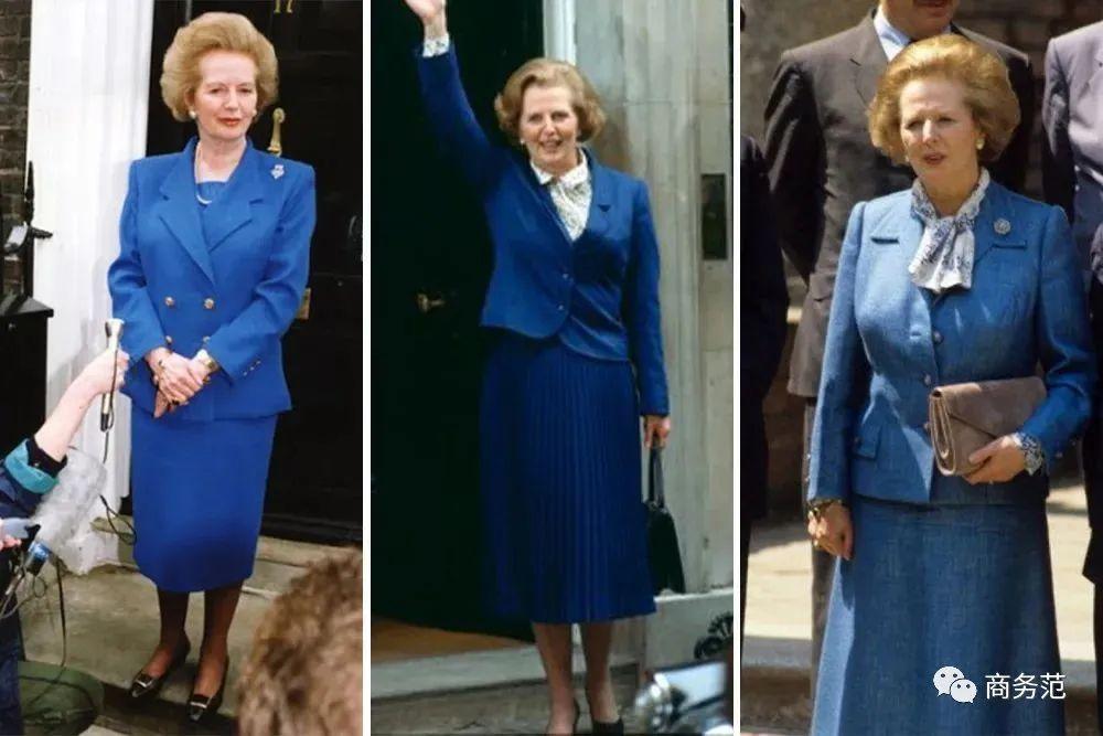 撒切尔夫人执政期间的衣橱主要都是蓝色色调,是她所在的保守党代表颜色。这些靛蓝、宝石蓝和王室蓝的蓝色套装,也是她power style的一部分。