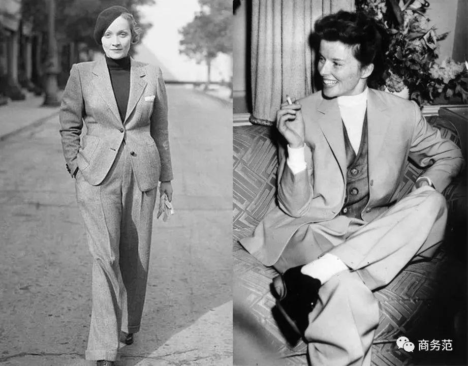 好莱坞黄金时代的女神们走得更远,像玛丽莲·黛德丽、凯瑟琳·赫本等,经常以裤装形象出现,在当时很有颠覆性。左图玛丽莲这种套装+高领衫的搭配,今天很多女大佬依然还会这么穿。