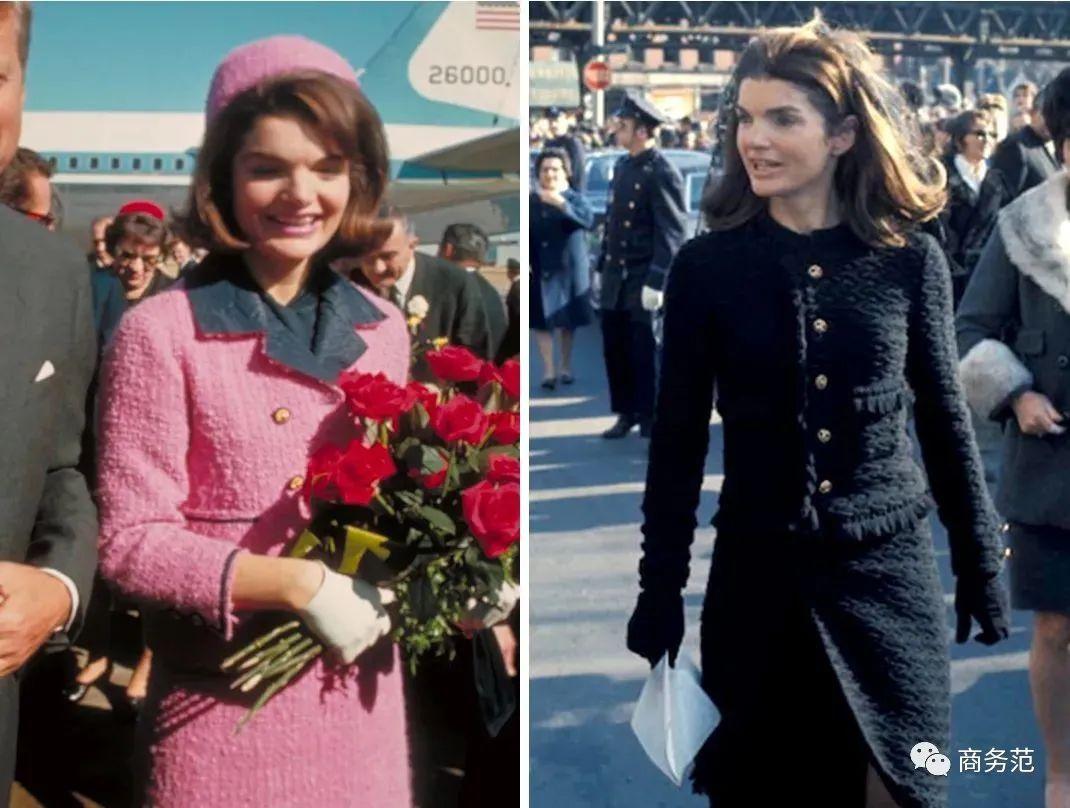 这一时期,具有现代风格的套装也开始出现在政务场合,比如当年的美国总统夫人杰奎琳·肯尼迪,好几次亮相都穿了Chanel斜纹软呢套装,亮色黑色都上身过,优雅不失正式。