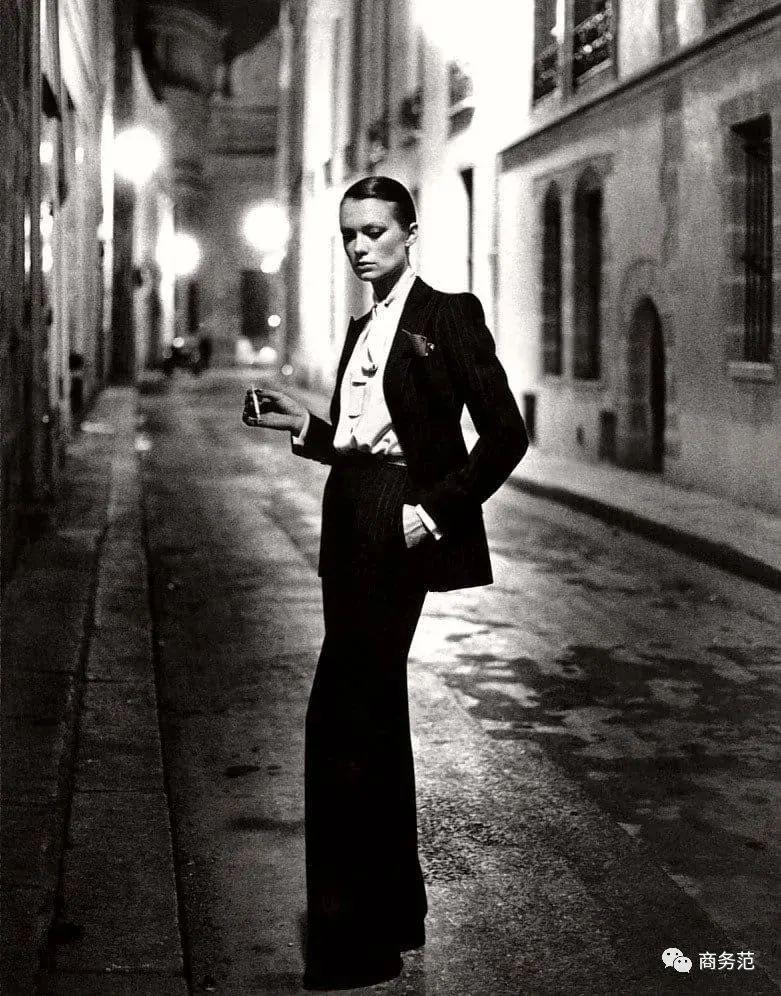 到了战后,Dior的New Look、伊夫·圣罗兰的“Le Smoking”吸烟装都登上历史舞台。像吸烟装直接由男式西服套装演变而来,塑造出女性优雅且强悍的形象。