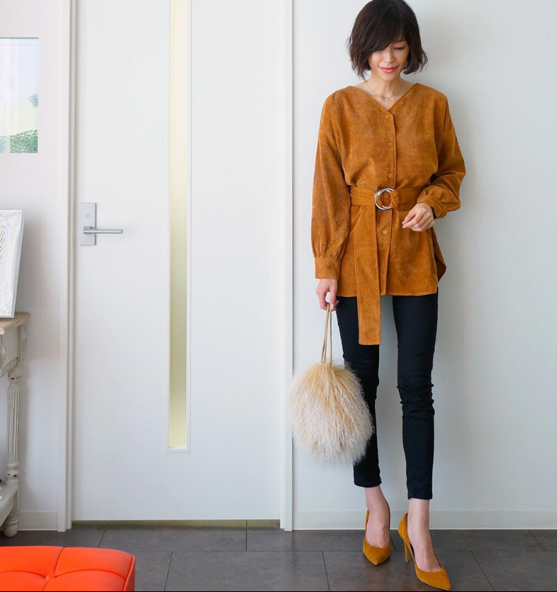 博主高山玲奈的很多穿搭中,她就忽略了腰线的存在。她的惯用思路是选短款上衣,用短上衣+长裤/裙 ,或衣服本身是没有收腰设计的短上衣,通过短+长的穿搭思路来打造视觉反差,这样就算腰腹有肉也会因版型而适当弱化。