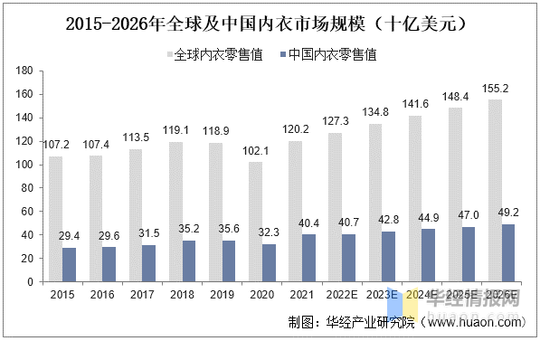 2015-2026年及中国内衣市场规模(十亿美元)