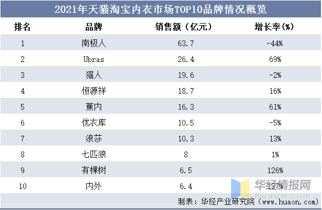 从企业销售情况来看,根据天猫销售数据显示,2021年天猫淘宝内衣市场TOP10品牌中,传统品牌如南极人、猫人、恒源祥销售表现良好,但增长乏力,南极人的销售增长率仅为-44%,猫人为-2.0%。而新锐品牌如Ubras、蕉内、有棵树、内外则增长力度强劲,同比增速均超60%。