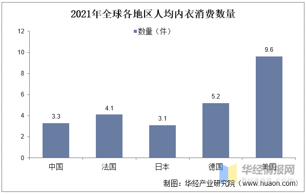 从各地区人均消费数量来看,中国人均内衣消费数量低于大多数发达。相关数据显示,2021年中国内衣人均消费量为3.3件,相比于美国人均消费9.6件还存在一定差距。