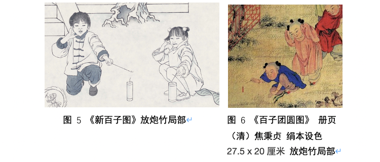 画面上部建筑入口的前方描写了两名放炮竹的儿童,鞭炮感觉在下一秒便会被点响,烟花即将喷射而出,这里描绘的其实是除夕的节俗活动。王安石(北宋)的《元日》曰:“爆竹声中一岁除,春风送暖入屠苏。”,过年放炮,是具标志性的中国节俗文化之一,早源于南北朝时期元日驱鬼除崇的习俗,尽管现在城市为了防止环境污染,燃放烟花炮竹被禁止了,但是这仍然是孩子们喜爱的一项具有悠久文化传统的除夕节俗活动。