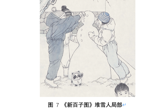 再说回“堆雪人”的图像,抛开历史的宗教特征,我也将当代的文化符号置于其中,在雪人的下方摆放了一个冰墩墩,这是2022北京冬奥会的吉祥物,是孩子们这一年冬季为喜爱和追捧的玩具,也是属于当代及后世所有中国人关于冬天的深刻的记忆,它是属于这个时代的百子图中的“新”的文化符号。