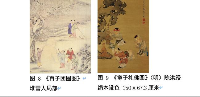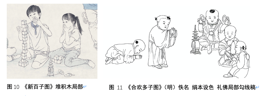在放炮竹儿童的右上方描绘的是三名儿童堆雪人的情景,这是古今中外儿童都热衷的一项冬日游戏活动,但在百子图中此图像具有更深刻的涵义。焦秉贞(清)曾绘《百子团圆图》(册页),其中一幅描绘的便是儿童在冬日堆雪人的情景,但是这个雪人并非是我们常见的雪人样貌,更像是一尊佛像,晚清画家华喦在其系列作品《婴戏图》中曾摹仿焦秉贞的这幅画,并题诗“儿童亦爱西天佛,破却工夫雪作成。”,点明此图像缘自“童子礼佛”这一婴戏题材,而这是自唐始,在宋明时期极为流行的一种婴戏图图像,体现了佛教对于民间风俗和绘画艺术的影响。与这一宗教题材相近的图像还有“聚沙成塔”,“筑塔”其实是佛教中一种积累功德的修性行为,据《大正藏》记载:“若于旷野中,积土成佛庙。乃至童子戏,聚沙为佛塔,如是诸人等,皆已成佛道。”童子聚沙成塔图像早出现在敦煌第23 窟北壁,明代笃信佛教的画家陈洪绶曾绘《童子礼佛图》或是这一题材具代表性的画作。后世的婴戏图和百子图常见此类图像的衍生图,比如将“沙”换成“砖”,堆垒成塔后将佛像置于其中,童子跪拜于前,如《百子嬉春图》(传宋人)、《合欢多子图》(明);或将佛塔作为把玩的物件置于身侧,如《秋庭婴戏图》(宋苏汉臣),这或许可以称为当代儿童玩具积木的早雏形。在这幅《新百子图》的中下部亦绘有两名儿童垒积木的情景,高高错落垒起的积木似乎摇摇欲坠,男孩手持一块积木意欲再添之,女孩紧张得捂住了嘴巴,而在女孩的前方摆放的便是一座内置佛像的佛塔和常常与它一同出现的饶钹,而佛塔的图像便是取材自明代的《合欢多子图》,尽管它现在已不再是儿童把玩的物件,儿童也不再礼佛拜塔了,但却可以通过图像映射出这一游戏背后深厚的历史文化渊源。