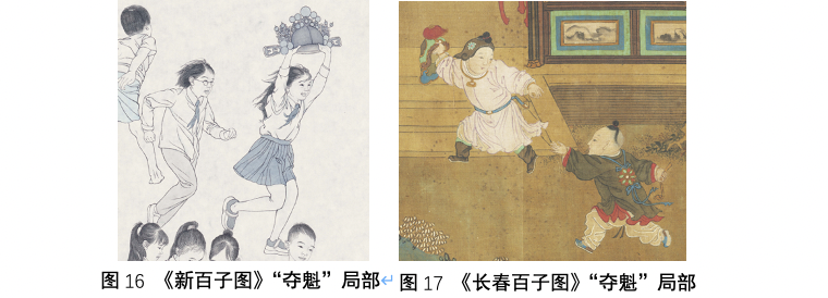 右侧小女孩单手高举魁星图,魁星为青面獠牙鬼魅状,左臂持斗环抱于胸前,右手高举一只毛笔,左脚高抬。早在先秦时期的《吕氏春秋》中即以星宿“魁”比喻才华出众之人,后来,“魁星”逐渐与科举考试建立起联系并成为“主文运、喻状元”的象征,“夺魁”至今仍然常被比喻为高考中第或竞赛夺冠,并在明清时期衍生出“夺盔”(取“盔”与“魁”的谐音)的婴戏图像,也是百子图中常见的图像。在这幅《新百子图》的中部即描绘了一女童高举头盔奔跑,后面一个男童追赶的画面,表现了登科致仕的传统儒家思想,也表达了对于下一代的美好期许。与此相类的还有“折桂”,画面右侧描绘了一名童子攀树折枝的情景,这既是古今儿童常见的嬉戏活动,也是百子图中常见的图像。桂树在道教典籍的记载中是可以益寿修仙的神树,后来因“桂花四出”的特质而寓意君子的高洁品格,由此逐渐演化出恭祝登科取第之祥语,如“唾手桂枝,近龙头而中隽”,“折桂”便逐渐演化为科举及第之辞。又因桂树丛生的特点亦常用于象征子孙繁盛、家族兴旺。