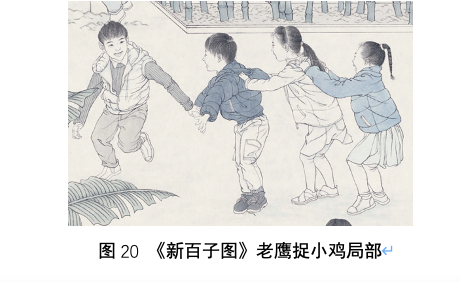 画面中奇石的右上方表现了四名正在玩老鹰捉小鸡的儿童,这个游戏出现于晚清民国时期,也是晚成为百子图图式内容的图像之一,并不具备特别的文化内涵,但是这个游戏却是一个时代的童年记忆。如今的小孩已经很少玩这个游戏了,它可能很快就如同宋代风靡一时的推枣磨游戏一样很快就要消失了,这个图像在这里权当是一种纪念吧。