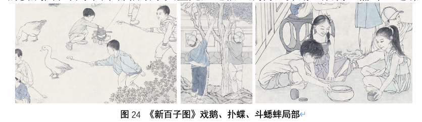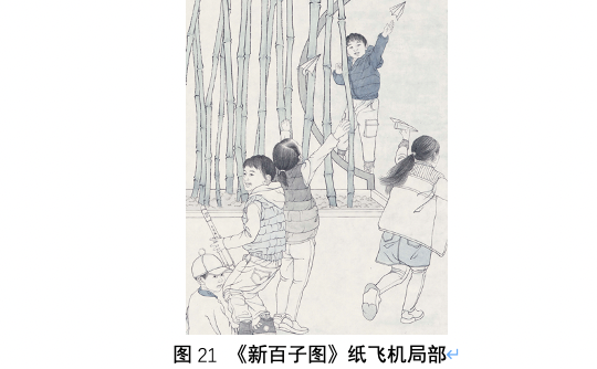 这组图像的右边表现了四名玩纸飞机的儿童,这个图像是百子图图式里并不存在的,是新内容,描绘了这个时代的儿童几乎都会折的纸飞机,这其实表现的是当代儿童对于飞翔和天空的幻想,类似于后面会讲到的古代儿童放纸鸢的起源,儿童代表了人类的初期形态,因此儿童的很多行为与想法都反映了人类思想深层的本源欲望,而这个时代的中国人仍然怀揣着同古人一样的“嫦娥奔月”的理想,所不同的是,今天的我们已经飞向了太空,登上了月球,这也是当代中国为突出和璀璨的成就之一,是属于这个时代的华彩,因此画面中手持中国航天飞船模型的男孩尽管回望画内庭院,但身体趋向这群追逐纸飞机的孩子们,一同奔向了另一个未知的画外空间,寓意充满希望的祖国未来。