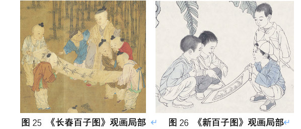 在这组“纸飞机”图像的下方描绘的是秋季情景,分别刻画了五组图像,即儿车戏、戏鹅、观画、折桂(前文已述)和看VR。