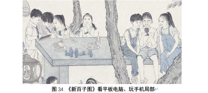 秋季场景的后一个画面在桂树下方的奇石旁边,描绘的是两名儿童戴VR眼镜体验虚拟现实的情景,这部分也是百子图的“新”内容。我们这个时代又常被称作是信息化的网络时代,电子产品和网络充斥于我们日常生活的每分每秒,几乎成为了如同空气和食物一般必不可缺的元素,彻底改写了我们的生活方式和思维模式。儿童的天性决定了他们对于新奇事物的喜爱,电子产品及相关的游戏和动画几乎取代了过往的所有玩具,成为了当代儿童的爱。虚拟现实和元宇宙概念更是将我们引领到了一个更加富于想象力和创造力的未知世界,VR眼镜作为这一技术的前端产品已经开始走进普通人家,成为了孩子们的新玩具。而除了看VR眼镜,还有手机、平板电脑和儿童电话手表,这些电子产品都已经成为了当代儿童必不可少的“新玩具”,也都被描绘在了画面中,作为这个时代的印证与记忆。