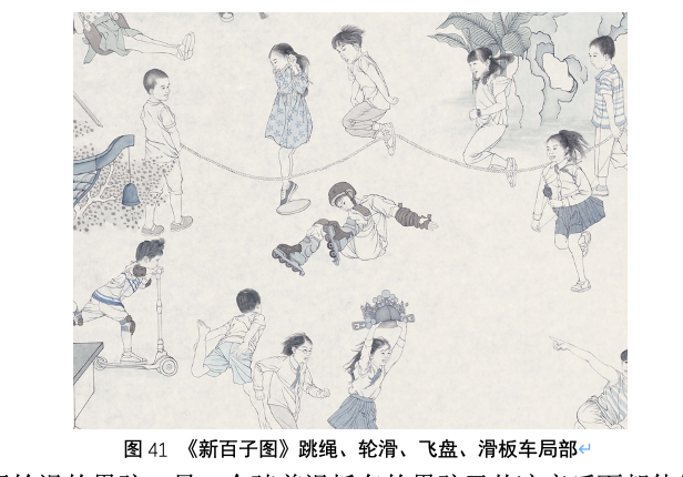 跳大绳,这项运动在我国已有一千多年的历史了,唐朝时称为“透索”,宋代时谓之“跳索”,明清时称作“跳百索”,两人牵绳并各执一端,然后快速摇动,众人跳跃其上。至今跳绳运动仍然是中小学重要的一项体育活动。轮滑、飞盘和滑板车是百子图中的“新”内容,也是除了跳绳以外当代儿童热衷的几项运动。画面在这里设计了一个戏剧性的冲突,玩飞盘的男孩不小心将飞盘击中了玩轮滑的男孩,另一个骑着滑板车的男孩又从凉亭后面朝他们快速冲了过来,男孩瞬间脚下不稳向后摔倒,却把正在跳绳的男孩吓得一跳老高,飞盘弹开又砸到前面跳绳的女孩的脚,吓得女孩双手抬起惊声尖叫,这一幕被两边摇绳的男孩和后面跳绳的女孩看在眼里,不禁笑了起来。