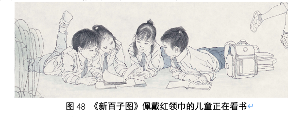 再说回画面的春季情景,除了前文讲述过的书写和夺盔,春季画面还有植树、捉迷藏和读书。植树和捉迷藏是传统图式内容,读书属于“新元素”,因为尽管自北宋的三次兴学运动后,尤其是宋徽宗开创了公立小学制度以后,儿童教育得到了社会的普遍重视,但不得不承认的是,儿童接受教育仍然是属于士大夫和上层阶级的权利,普通老百姓家的孩子,尤其是女孩子,还是很难接受教育,没有上学的权利。但是在当今的社会,儿童教育得到了和社会群众的空前重视,推行九年义务制教育让各个阶层的儿童都可以学习文化课掌握知识,每个家庭在孩子的培养和教育方面也几乎都是倾其所有,女孩也拥有了和男孩一样的受教育权利,“学生”这个称呼几乎可以成为“儿童”的代名词,而除了课本和书包,中国学生突出的标志莫过于红领巾了,它承载了中国特色的历史文化,也是这幅新百子图的突出标志。