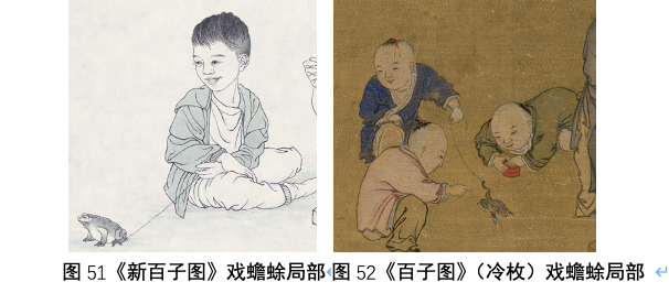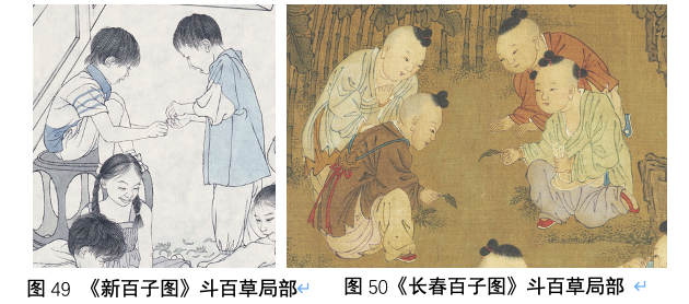 斗草,也称斗百草,是自南北朝时期已有的端午节俗,具有蠲除灾病和祈子的文化内涵,现在逐渐发展成秋日里拔叶根的游戏,是自古至今儿童都热衷的游戏活动;戏蟾蜍,现在几乎不再有儿童将细绳绑于蟾蜍腿上提绳戏之了,但是我还是将这一图式内容沿袭了下来,因为这既是自宋至清百子图中极为常见的图像,也因为蟾蜍身上集合了太多了中国传统观念——首先蟾蜍大腹多子,常寓意子孙繁盛;另据《淮南子》记:“鼓造辟兵,寿尽五月之望”,鼓造即蟾蜍,它具有“辟兵”的奇,可保天下太平;中国的神话故事中一直流传着日中有金乌,月中有蟾蜍,因此月宫也称“蟾宫”, 而古人常以“蟾宫折桂”来寓意科举及第,将蟾蜍与登科取仕联系起来,表达了对于儿童未来的美好希冀,同时蟾蜍亦寓意长寿和富贵。