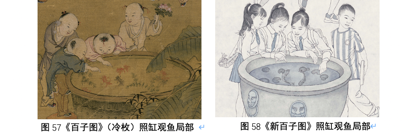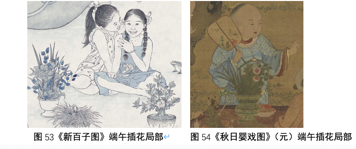 夏季情景其实集中围绕表现的是端午节和七夕节节俗活动。斗草、戏蟾蜍、插花、浴婴、照缸观鱼都是传统的表现端午节的图像,也是百子图图式的重要组成部分。