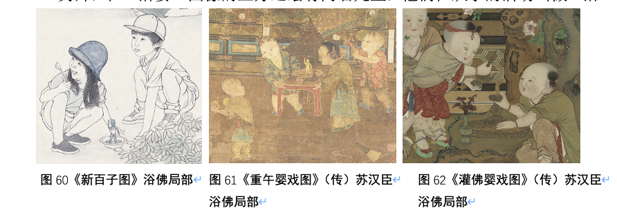 另外,在“浴婴”图像的上方还绘有两名儿童,他们在从事的活动叫做“浴佛”,这是在古代浴佛节儿童常常会做的一个活动,一金色盆中摆放一个小金人,一手指天一手指地,这是典型的佛之子的形象,儿童将水注于其顶,水流延其身缓缓流入金盆中,谓之“浴佛”,也是百子图和婴戏图中常见的题材,随着浴佛节的消匿,此项活动也变得极为罕见了,但我仍然把它描绘了下来,因为古代浴婴的仪式很可能与西域流传进来的沐浴佛之子的仪式有着密切的相关性,尽管目前没有确凿的史料查证此说,但(传)苏汉臣绘制的《重午婴戏图》中一个重要的内容便是众儿举行浴佛仪式,或可以从侧面佐证此猜想。
