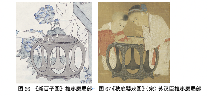 另外在石桌的旁边有一个圆凳,上面所画之物是在宋代十分流行的推枣磨,石凳旁边是芙蓉花,这里其实再现的情景便是婴戏图的鼻祖苏汉臣的那幅闻名于世的《秋庭婴戏图》(宋),这也是具代表性的婴戏绘画,画中玩推枣磨的男孩和女孩已经不在了,空留下还在枣核上空转的枣仁,似乎是穿越了千年的时光来到了今天,进入了这幅《新百子图》,尽管这个游戏现在已经消失了,但是把它画在这里,算是溯源,也算是致敬吧。