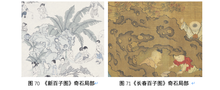 另外,在画面上部中心描绘了湖石与芭蕉叶的组合景观,这是古代百子图和婴戏图中常见的景致描绘,湖石体现了古人的石崇拜文化,庭院之中埋石能够辟邪驱灾,同时也与原始的生殖崇拜相关,具有祈子的寓意。而瘦、皱、透、漏、丑的奇石自古便是祥瑞的征兆,宋徽宗曾御制《祥龙石图》来表现艮岳中的奇石,而“石中有明”更是上瑞之兆,即石中的镂空自然地呈现出两小一大的形状,如同汉字“明”。画中的这块湖石便被描绘成了典型的祥瑞奇石。