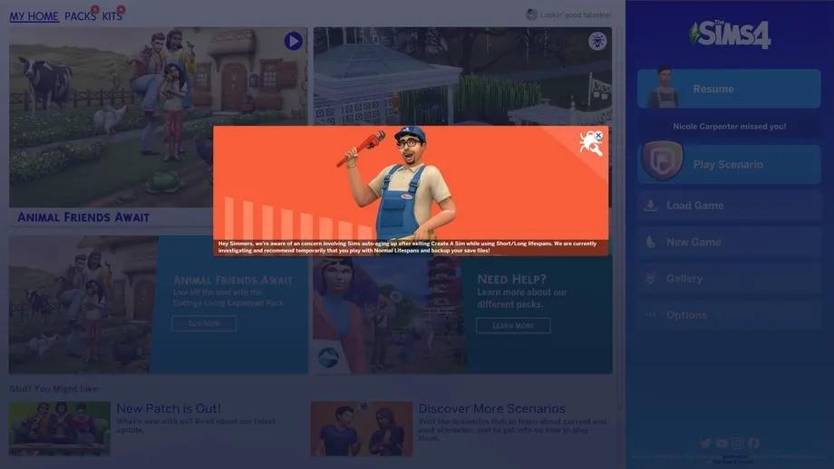 《模拟人生4》玩家将收到关于该错误的弹出警告,官方建议玩家不要选择短/长寿命(《模拟人生4》有三个寿命选项:短、正常和长)。