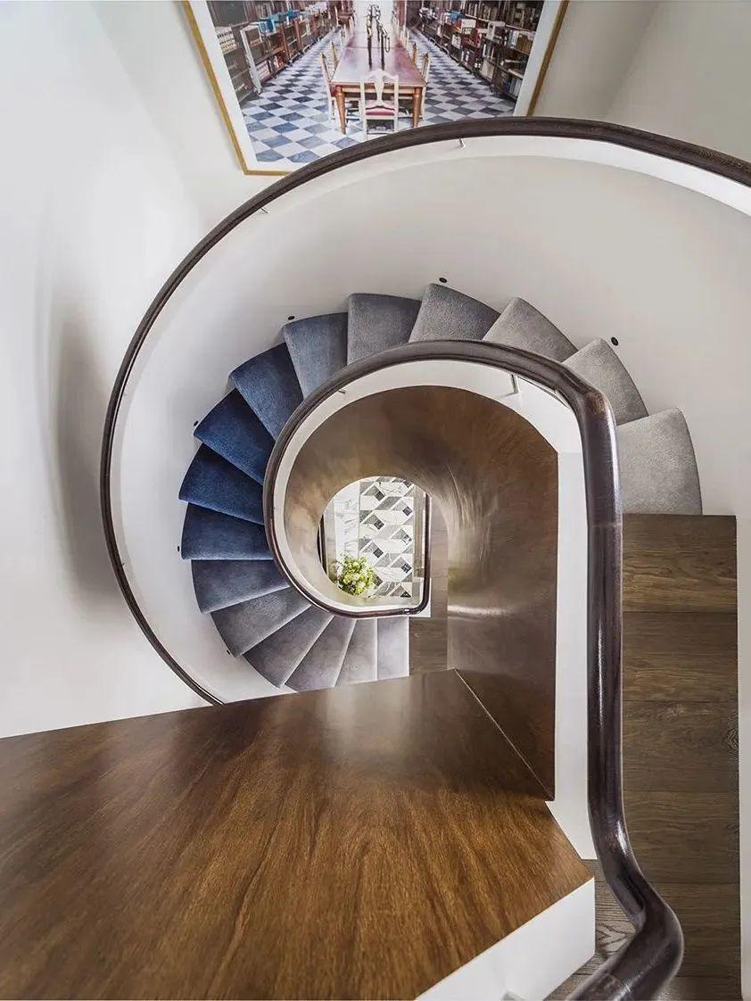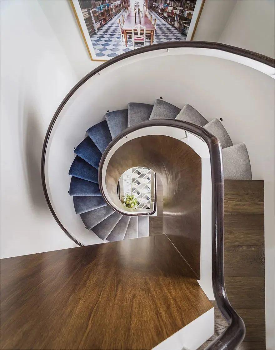 在主楼梯的设计上,从墙面上的照片中拾取色调,利用杂色调流道来加强连接上下空间阶梯的曲线,营造艺术美感。栏杆内部的白色油漆与栏杆外部的定制胡桃木油漆形成了美丽的对比。