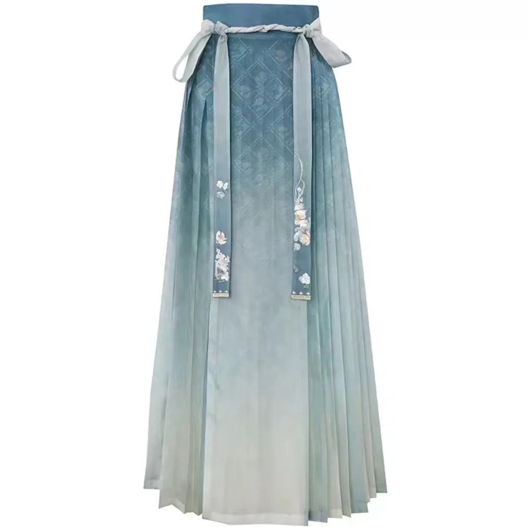 百迭裙百迭裙为一片式,中部打细褶,两边光面不打褶,穿着时光面位于身前交叠,为裙门。正面看似马面裙,侧面、后面看似褶裙。