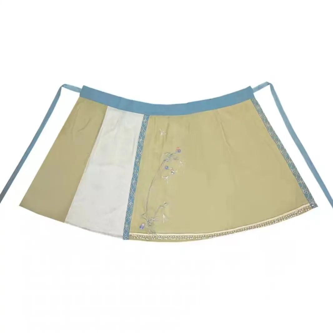 旋裙旋裙又叫两片裙,前后开跨,没有褶子,由四幅布组合成两片,缝合在一条裙头上,两片布在中间部分有交叠,搭配宋抹、飞机袖穿着。