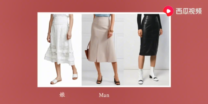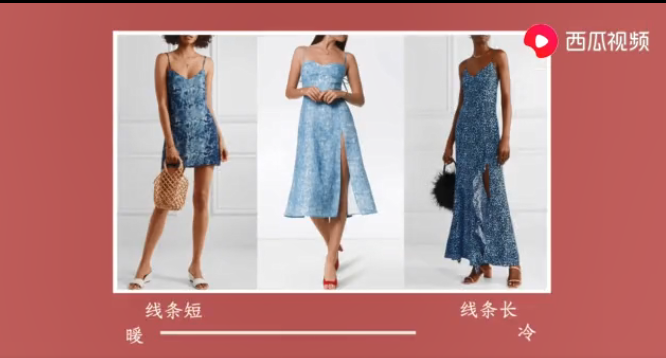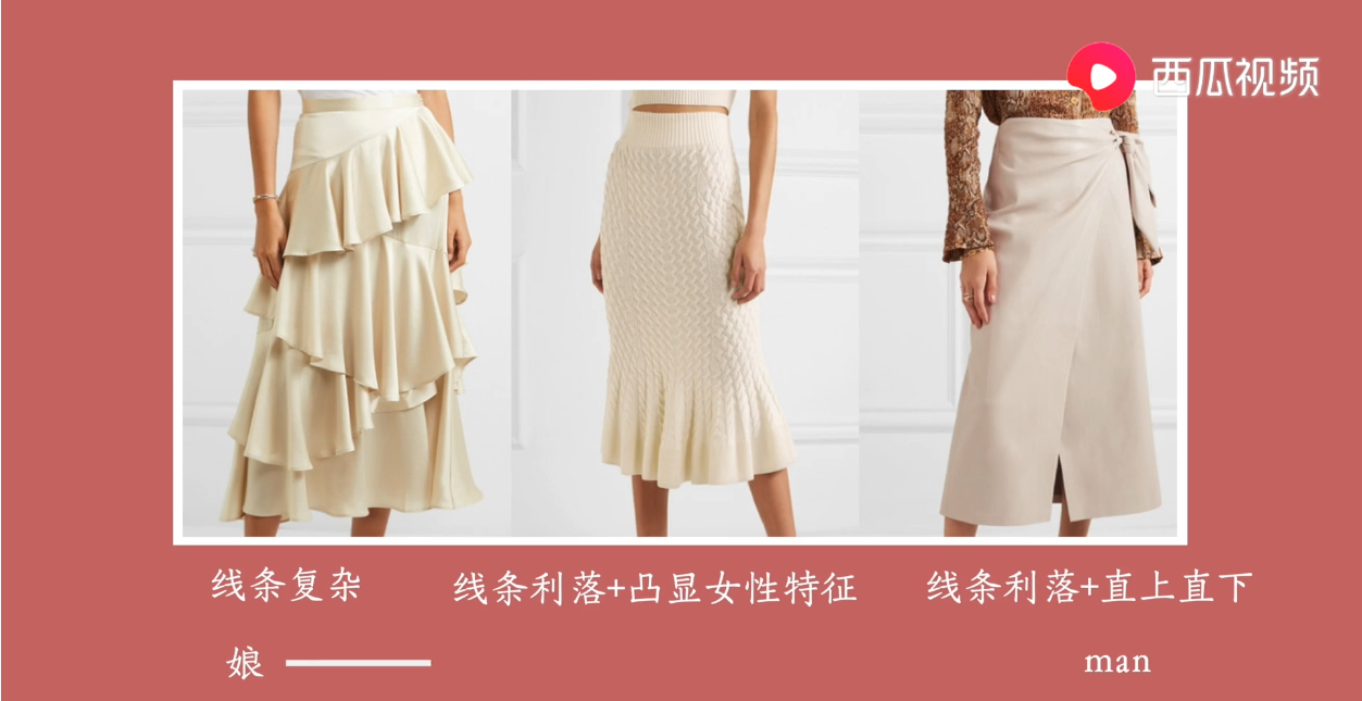 西瓜视频创作人时尚博主陈一丁,今天讲解的是好理解的线条这一要素。我们看线条的曲直和长短就可以了,例如上图中,左边的这条裙子,线条复杂曲线和曲面设计很多,女性化的程度就很高,中间这条裙子的线条不繁复了,看起来还算利落,也保留了一点女性的曲线,属于弱一点的娘的特征,而右边这条裙子,不光消减了这种复杂的设计,连曲线也大幅度减少,变成直上直下这样的设计,那么它就是这三条中man的一条。这样一看,我们就可以发现曲度越少、越不,man的属性就越强。