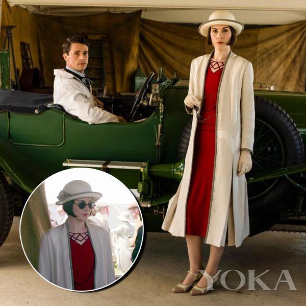 “Lady Mary的服装风格密码应该是个性的配饰和大胆的色块,第六季中,她在Brooklands赛车场上的这套服装很有代表性,灰白色的外套是我的得意之作,里面则身穿了樱桃红的连衣裙,头上还戴了跟外套搭配的灰白色礼帽,还有太阳镜!这一下就让她从众人当中跳脱出来了。”服装师Robbins描述这套她得意的造型。