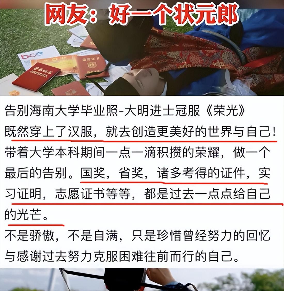 毕业照变化万千,但是也逃不出学士服的照片,毕竟这意味着学生已经取得了学士学位。一名来自海南大学的男生火了,他的毕业照并没有穿着学士服拍照,而是穿起了古代的进士服。
