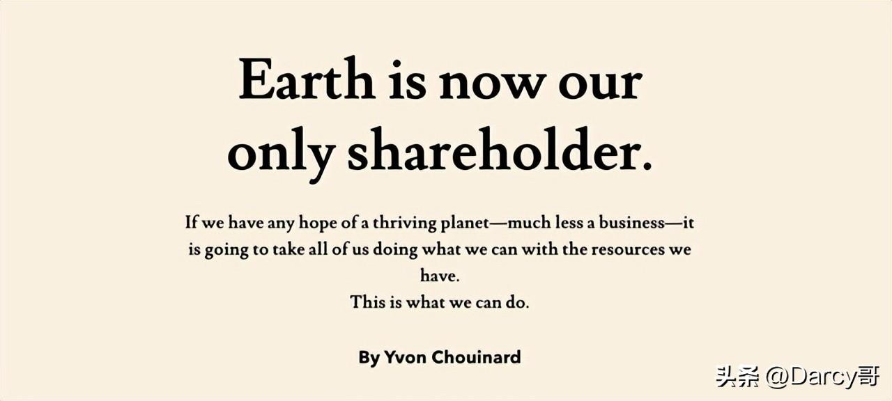 巴塔哥尼亚的官网上曾经刊登了创始人乔伊纳德的一封信,标题为:“现在地球是我们的股东”。他在信中写到:尽管地球的资源看起来无穷无尽,但这些资源并非是可以无限攫取的,而如今很人类已经超越了地球的极限。但地球也有韧性,如果我们下定决心,就一定能够拯救我们的地球。