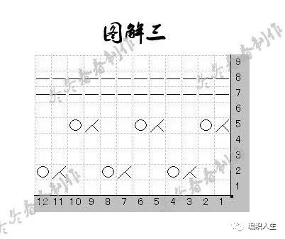 引返行3:双针,下针到起始记号处,下针到双针,下针织双针,3下,翻面;