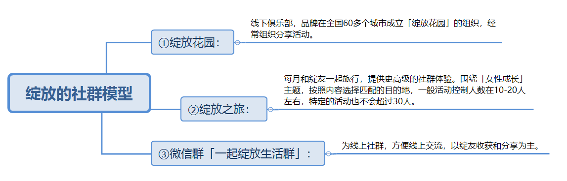 为了将绽友和品牌之间的关系打通,绽放从「参与感」入手,打造了3个社群模型: