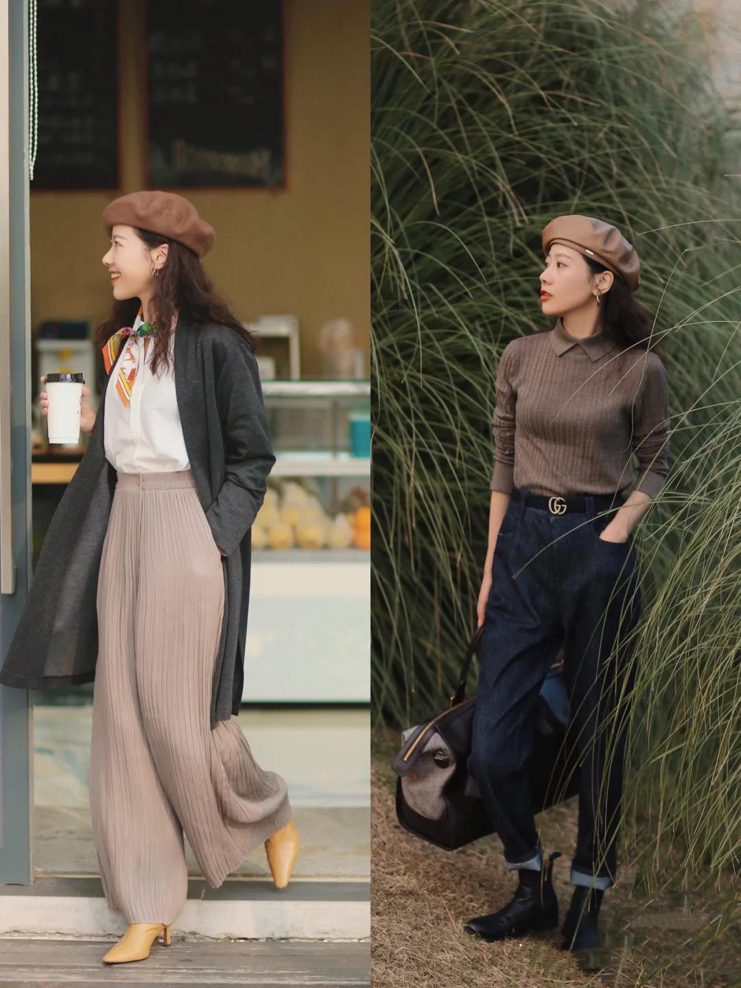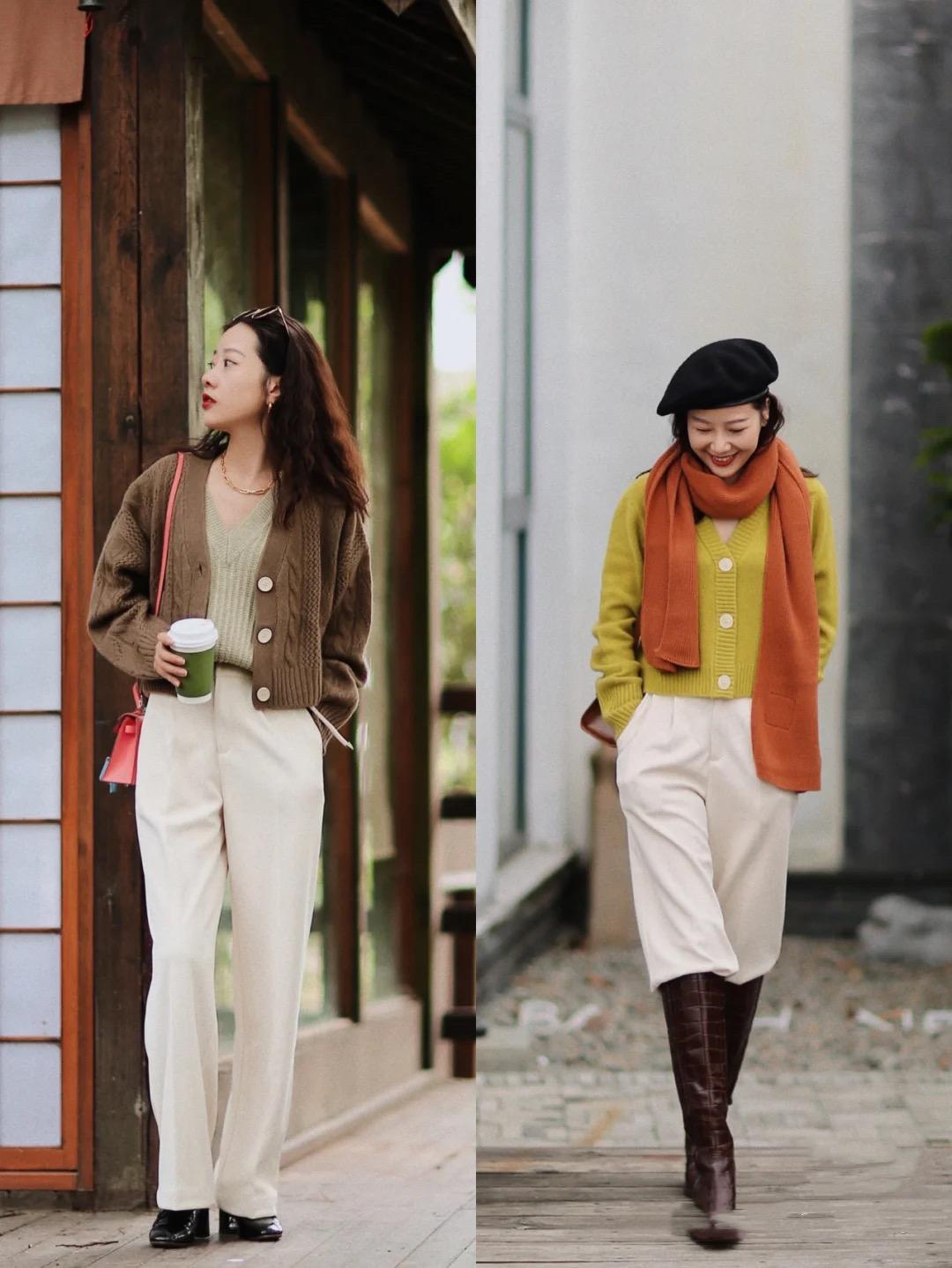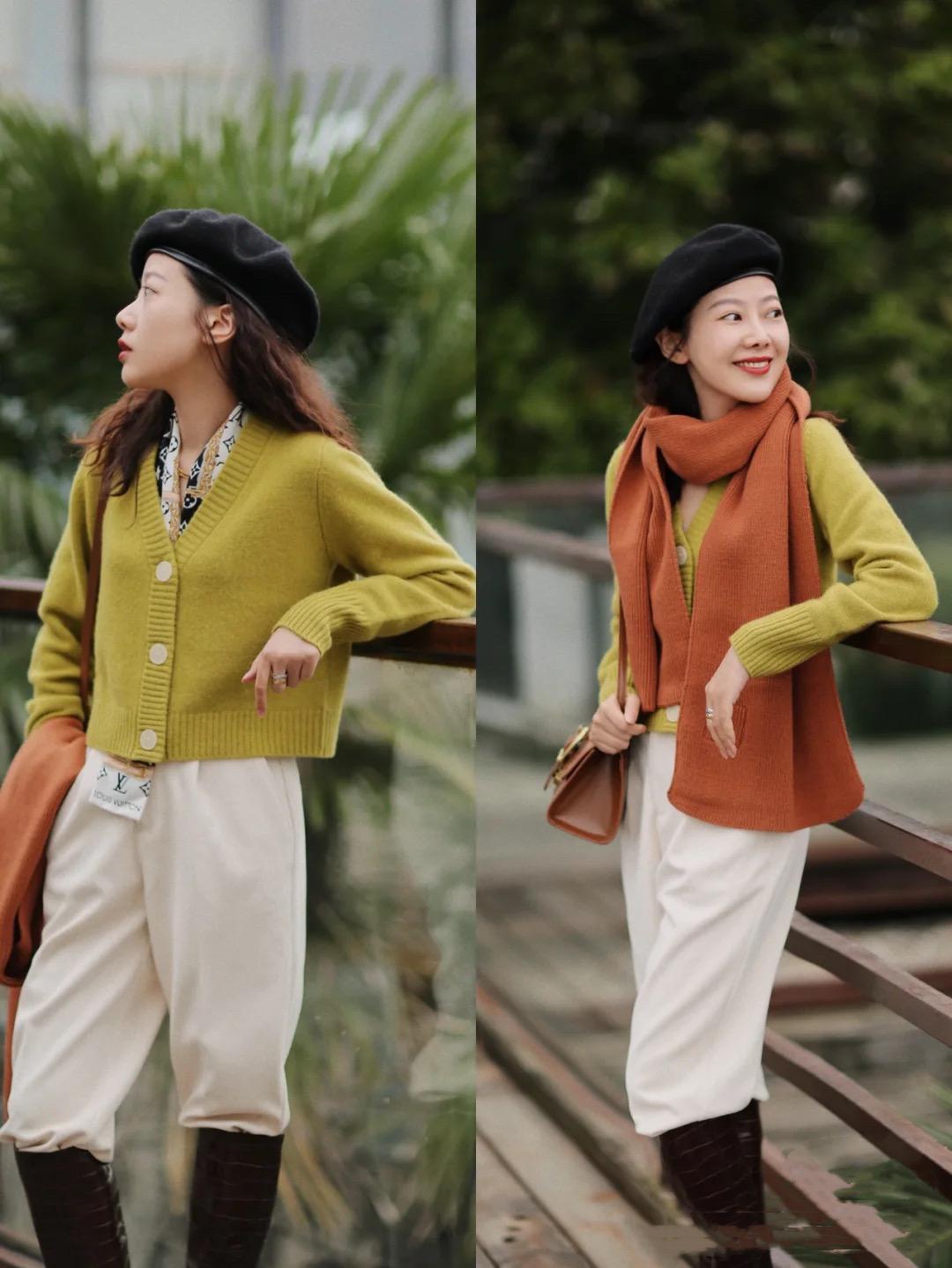 芥末绿的毛衣,选择了一种短款的开衫设计,搭配高腰的哈伦裤,自带休闲帅气感。配上精致的贝雷帽,也是女神范十足。不管是在颈部叠搭丝巾,还是组合长款的围巾,都很符合秋日的氛围感。
