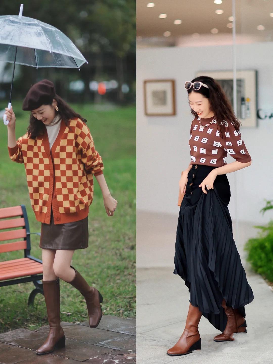 秋天里的毛衣,虽然更多地偏向深沉的色彩,但我们也可以加入几何元素的设计,让整体的穿搭更具亮点。宽松的毛衣开衫,经典的千鸟格造型,配棕色皮裙,也是百看不厌。