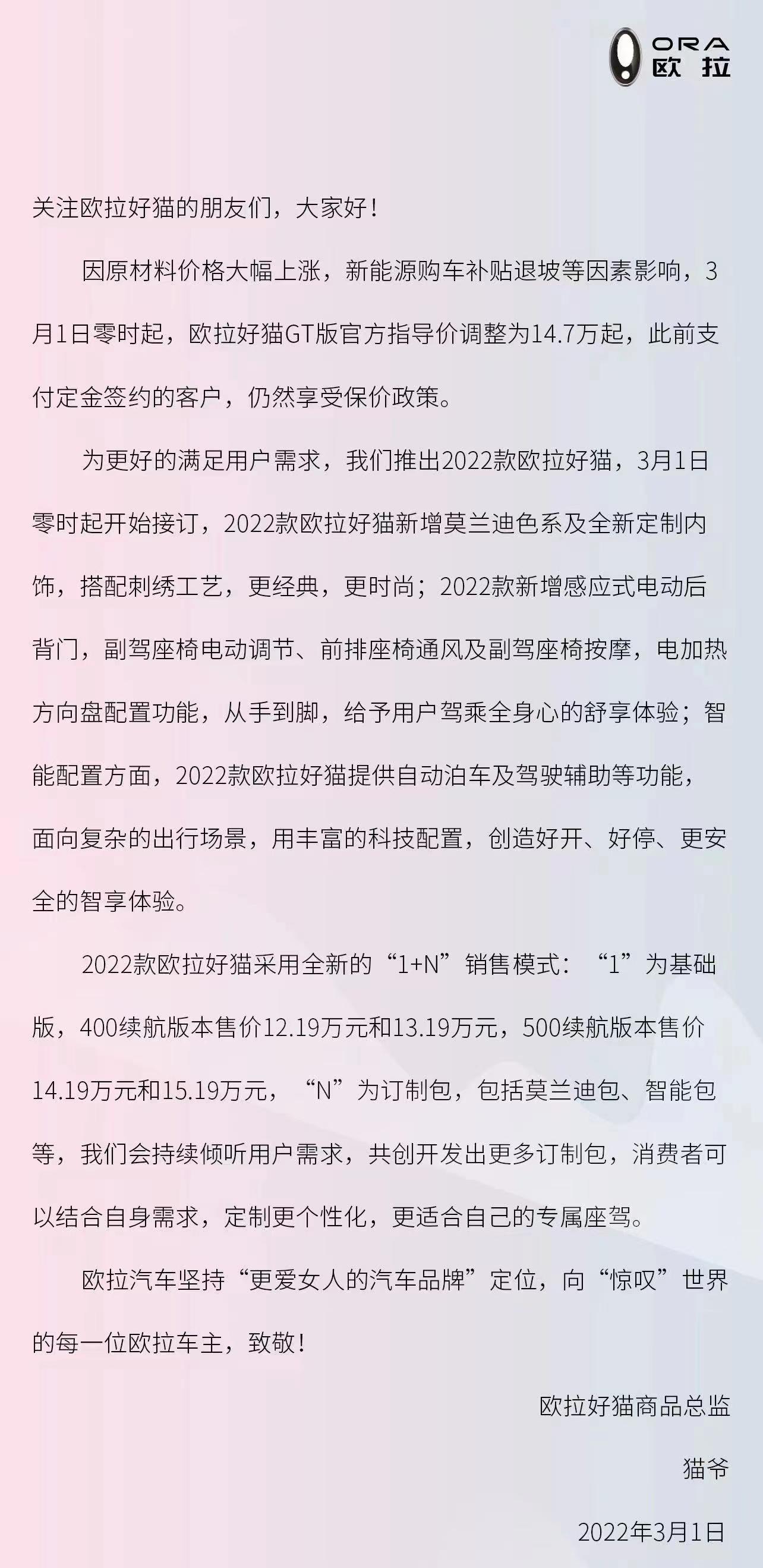 3月1日,在欧拉的APP上,官方发布了“3月1日起,2022款欧拉好猫开始接订,好猫GT版价格调整”的消息。2022款欧拉好猫售价12.19万-15.19万元。采用“1+N”订制模式:其中,“1”代表400km和500km续航的好猫基础版车型,每个续航又根据配置不同分为两种配置版本;“N”为订阅包,包括智能驾驶辅助和莫兰迪色选装包。不管购买哪个版本,用户都可根据自身实际用车需求及喜好订阅选装包。