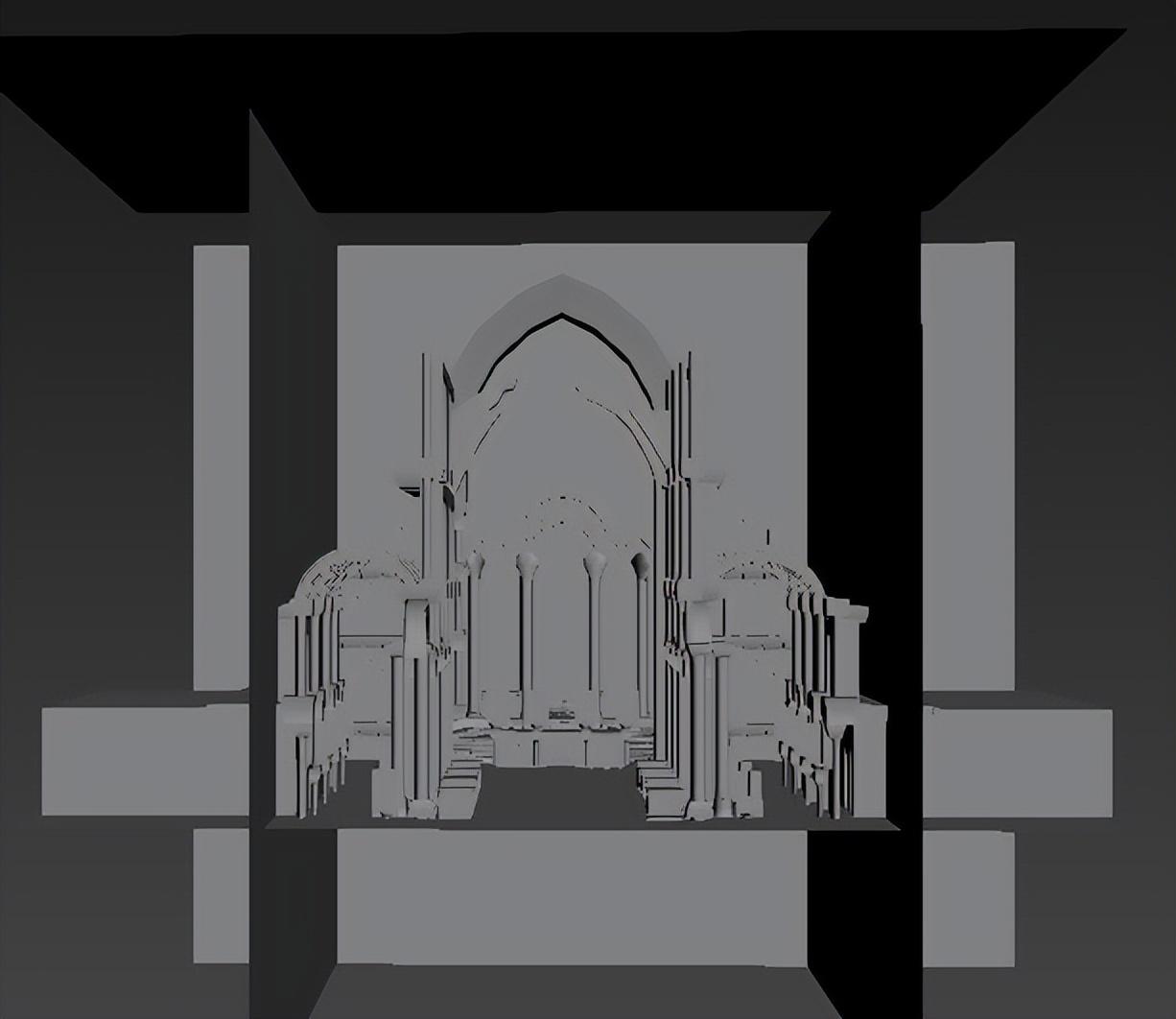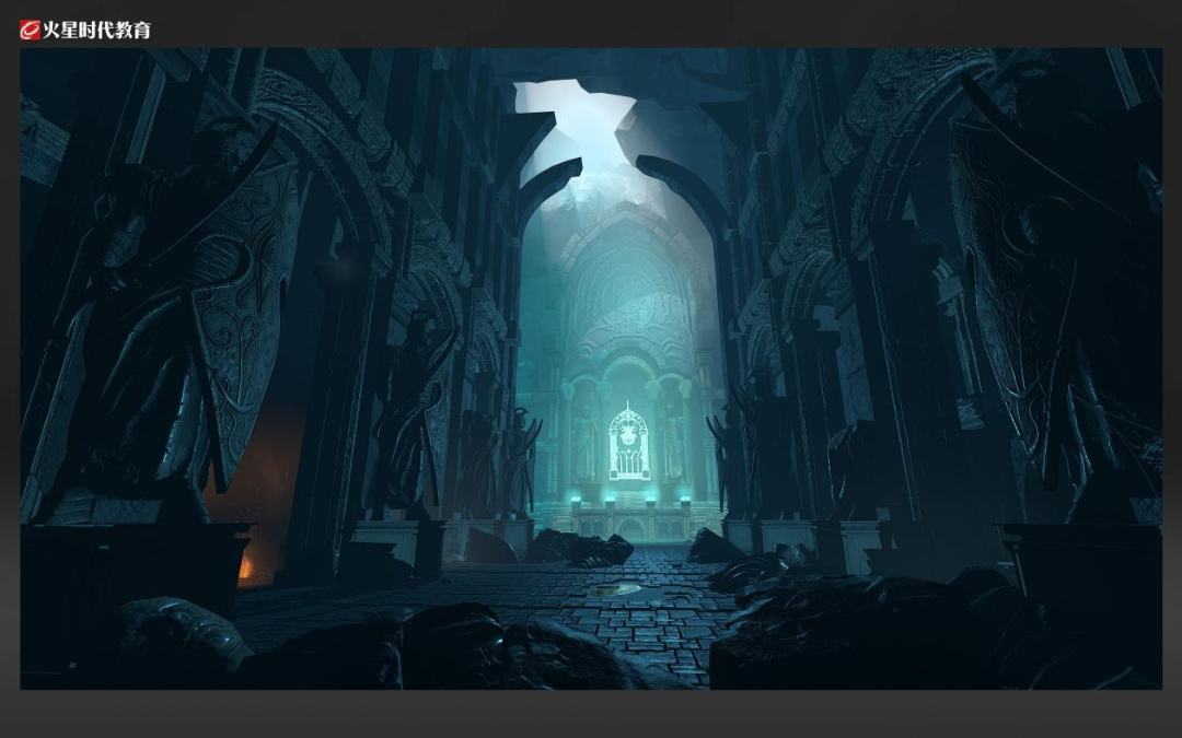 渲染我们用的是八猴3,八猴4的光线追踪比较吃电脑配置,且曝光严重。我们的场景是偏暗黑风格的,所以对整体的氛围感更加看重。特别是那一束天光,一定要表现出来,并且颜色要偏暖一点点,形成冷暖对比。