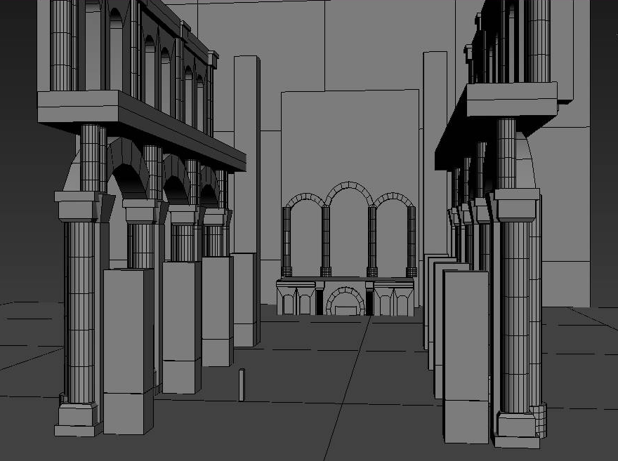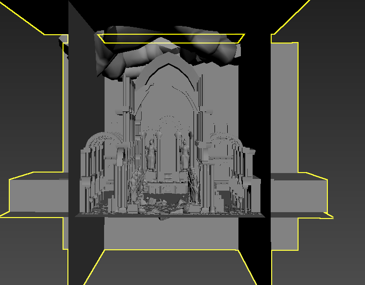 雕像部分人物直接用初始裸模,然后在3DMAX里制作衣服道具的中模,转成高模之后就进ZBrush里面雕刻。难点主要在衣服布料的雕刻上,必须先将布料的褶皱感做好,然后才能在布料的基础上再用推平笔刷将它的石头硬感表现出来,后才是上裂纹和噪波。