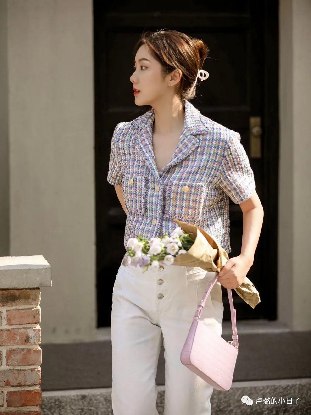 想要粗花呢可以选择西装款式的短袖外套,搭配同色系的下装或者白色的服饰,是很温柔的职场女性。