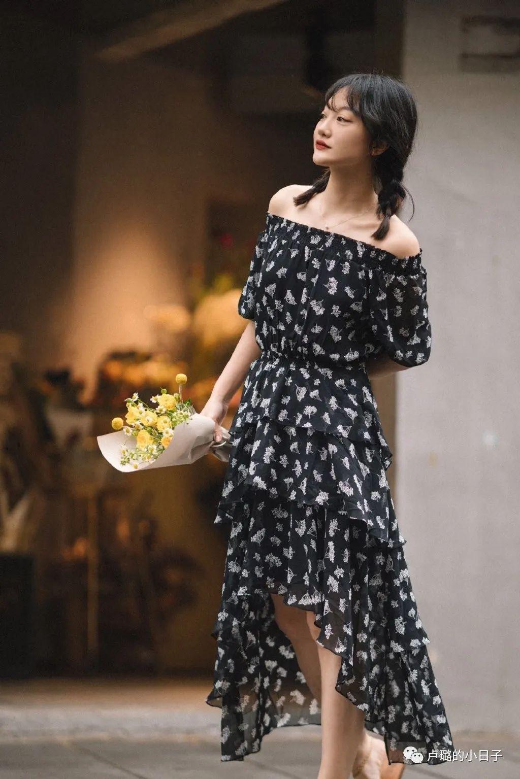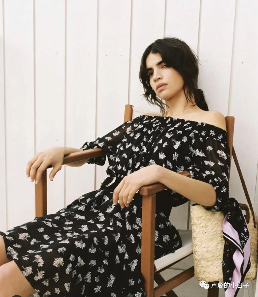 这件一字肩的黑色印花连衣裙,中法模特上身的感觉很不一样,果然印证了那句话:“还是得人穿衣才能看得出感觉。”