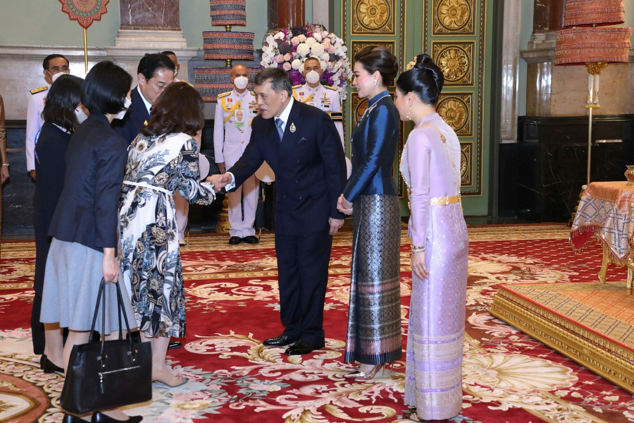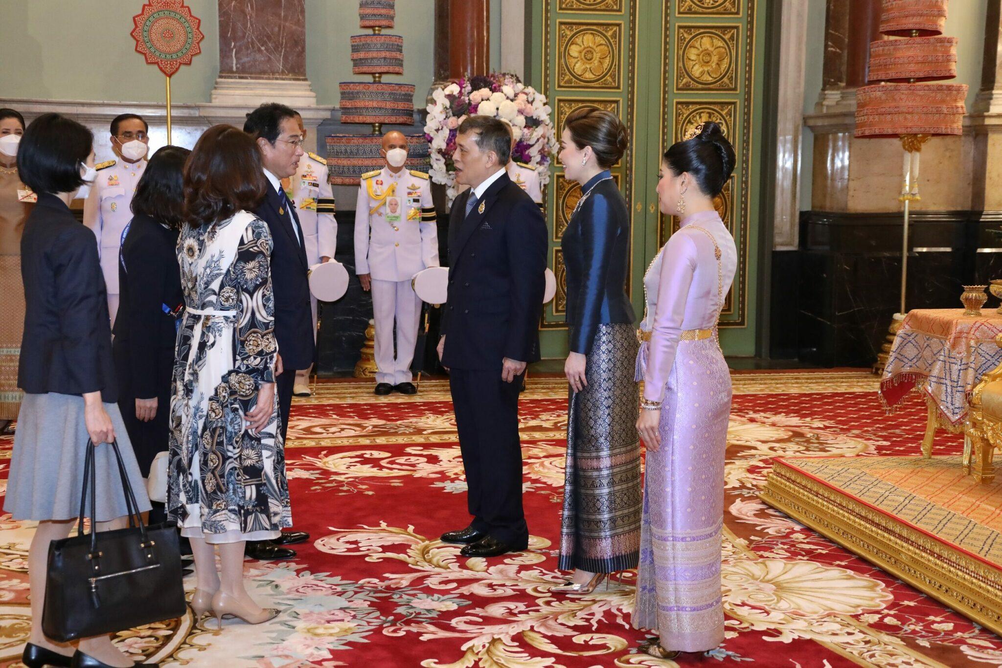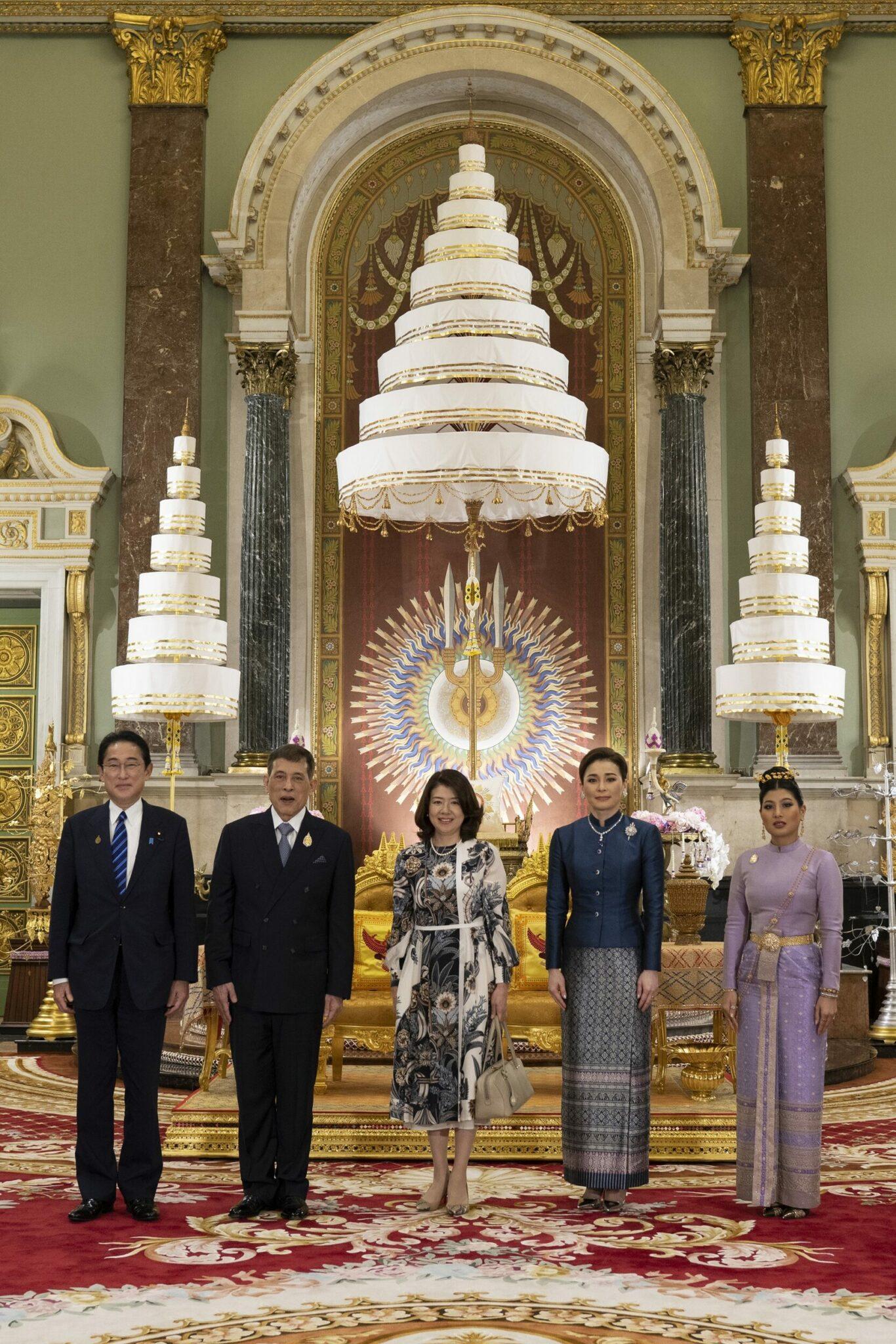 日本夫人岸田裕子在大皇宫会见泰王和苏提达王后的时候,又换成了一身小清新的造型,这条向日葵花朵的连衣裙,虽然不像苏提达王后的传统泰服那么紧身,那么显身材,却洋溢着快乐和小清新的一面。