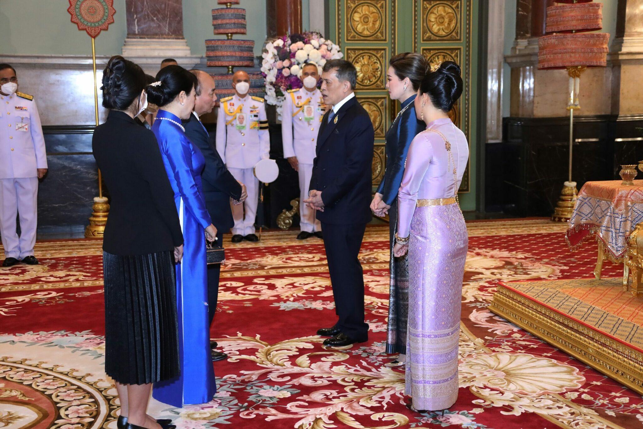 越南第一夫人这身蓝色的传统奥黛,刺绣图案有东方韵味啊!同样都是蓝色的传统服饰,苏提达王后的蓝色泰服更加贴身一些,而Siri公主粉色泰服加进去,整体的画面真是太养眼了,饱和度这么高的颜色,竟然一点都没有俗气的感觉,尽显雍容华贵的气质。