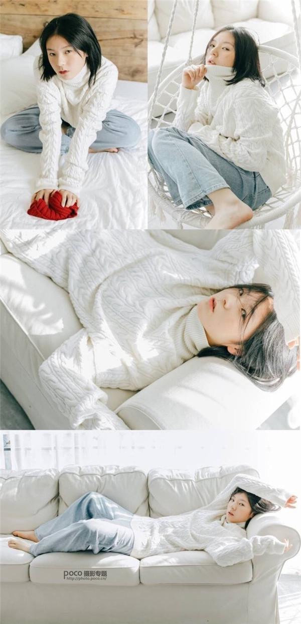 紧接着穿上毛衣开始拍摄,在床上的拍摄姿势大概就是躺着、趴着、坐着、站着就可以啦。