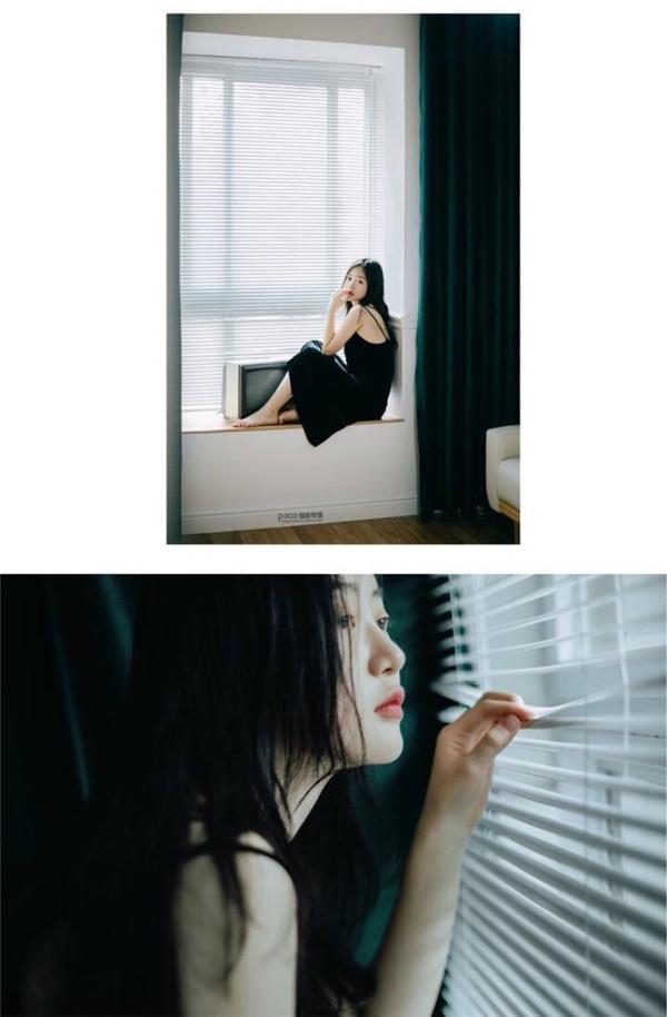 这件房间较简约,优势是飘窗那一块很好看,房间很有格调。因为光线的缘故,我放弃了在床上的拍摄,选择了飘窗。窗帘是墨绿色的很有质感,所以相应搭配黑色丝绒质地的吊带裙。