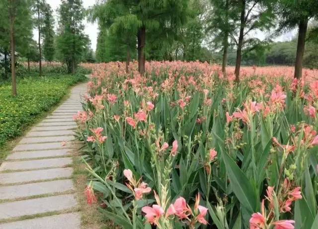 大片的粉色美人蕉,长长的路,美好的感觉!