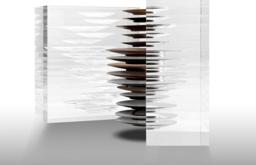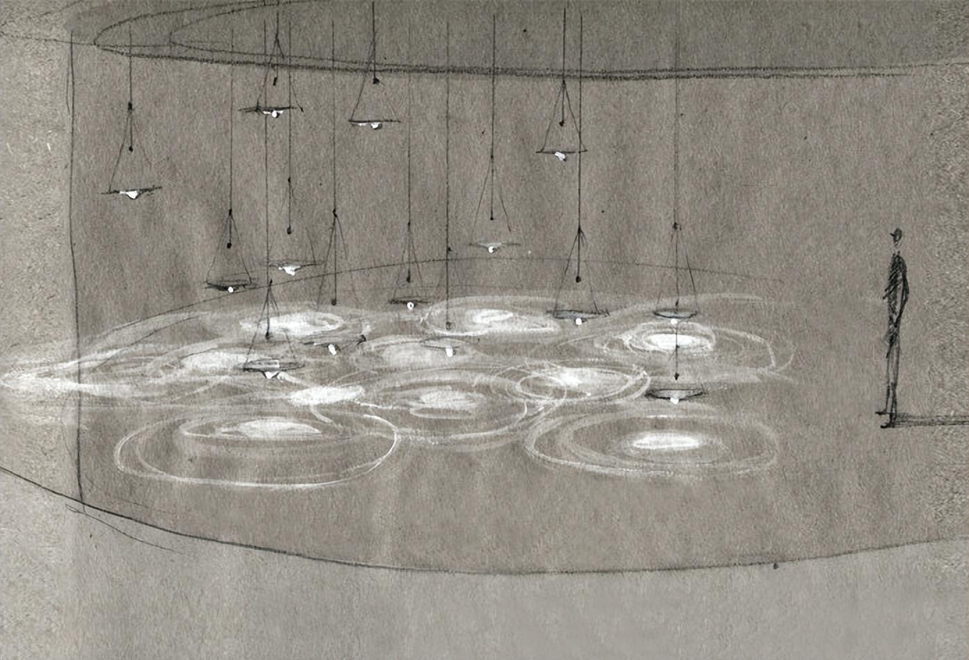 Momento灵感来源于水滴。玻璃上方有个点状的光源,光透过“水滴”时会发生光线集中。“水滴”周围的一圈玻璃并不是光滑的平面,而是特意留下的一圈圈轨迹。